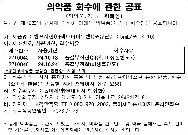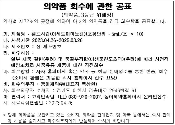 동아제약 챔프시럽(아세트아미노펜) 빨강에서 일부 제품번호의 제품이 갈변에 의해 리콜이 결정된 사실이 있었습니다.